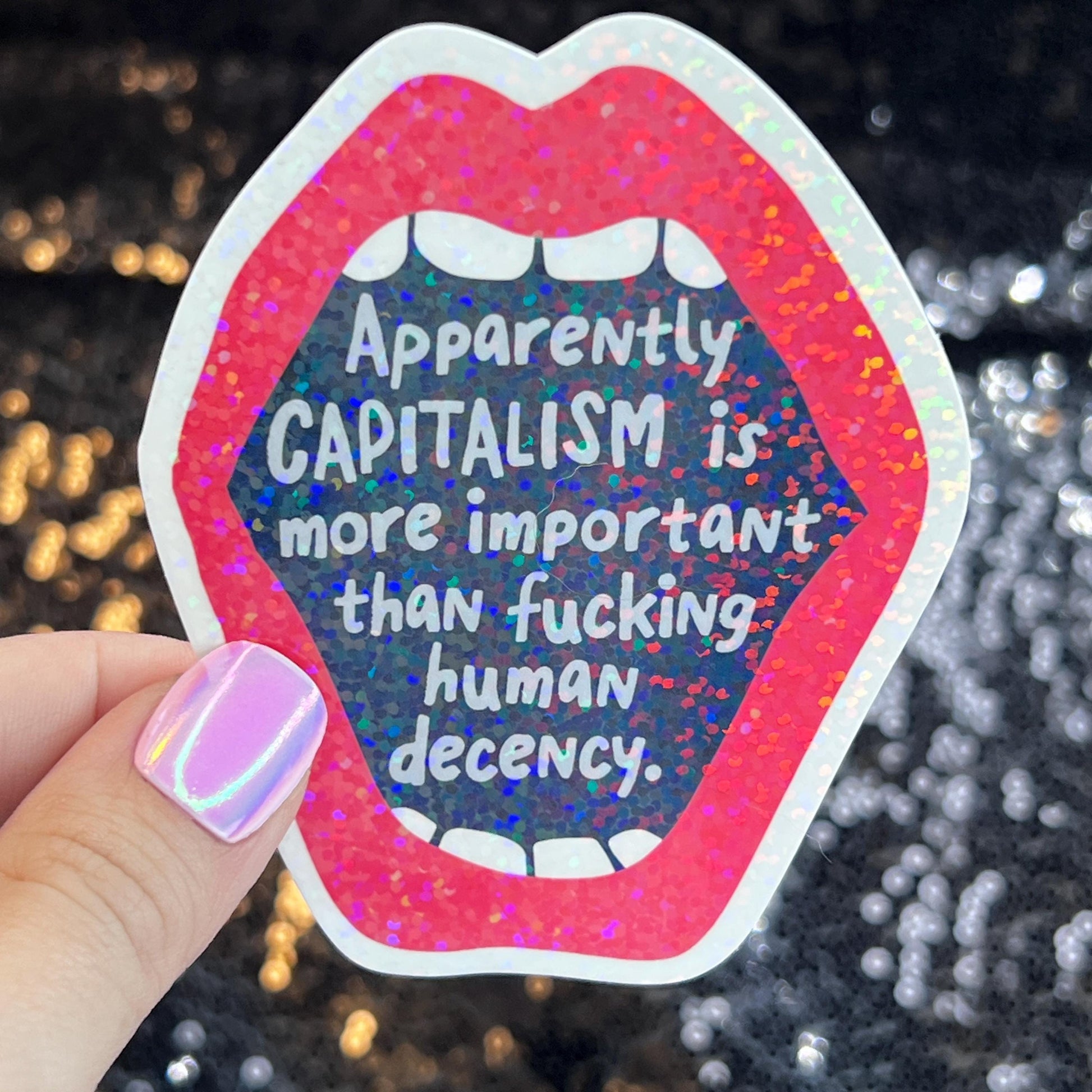 This holographic sticker, measuring 3 inches at its longest edge, boldly declares that capitalism often takes precedence over human decency. Its shimmering, reflective surface captures attention, representing the strength and spirit of those resisting oppressive beliefs. Ideal for laptops, journals, or personal spaces, it’s a striking way to showcase your support for women’s rights and stand against figures like Trump and J.D. Vance. Crafted from durable, water- and scratch-resistant holographic vinyl, this sticker is built to last and make a statement. Perfect for feminists, political activists, and anyone opposing regressive views.
