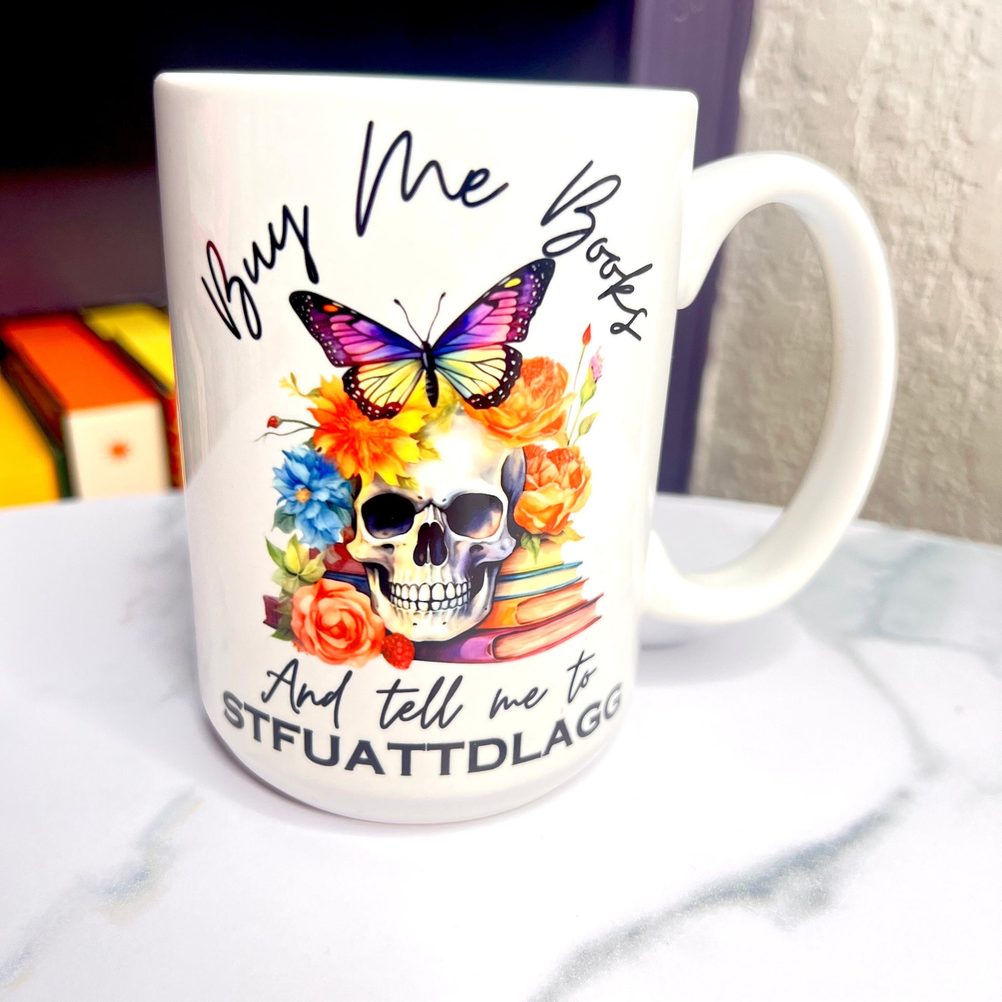 Buy Me Books and tell me to STFUATTDLAGG ceramic Mug. Elevate your coffee game with our 15 ounce mug. The unique design, applied through sublimation, ensures it's dishwasher safe, making cleanup a breeze.