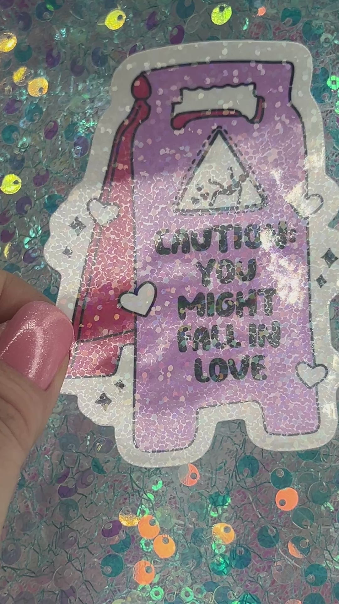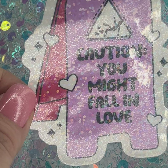 This sweet and silly holographic sticker features a pastel caution sign that reads “Caution You Might Fall in Love.” Designed for soft hearts, gentle chaos, and people who express themselves through cute humor.