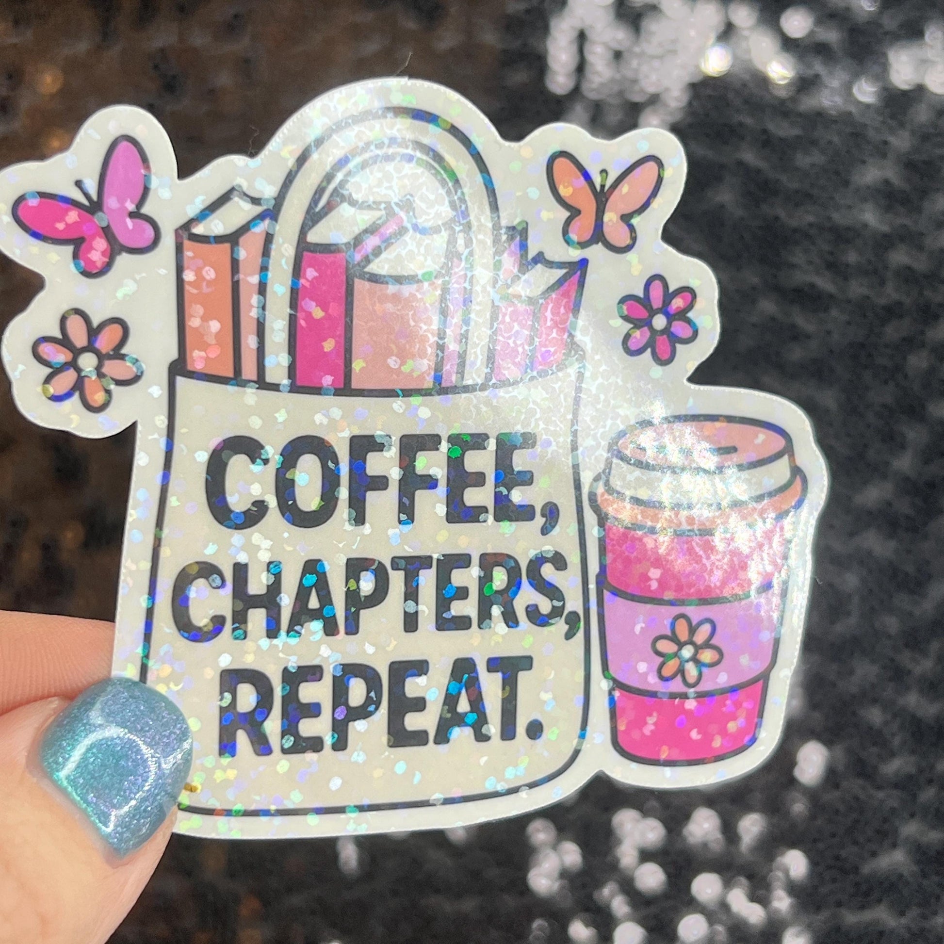 Coffee Chapters Repeat Holographic Sparkly Sticker Iced Coffee Lover Book Lover Romance Booktok kindle waterbottle laptop Romance Decal