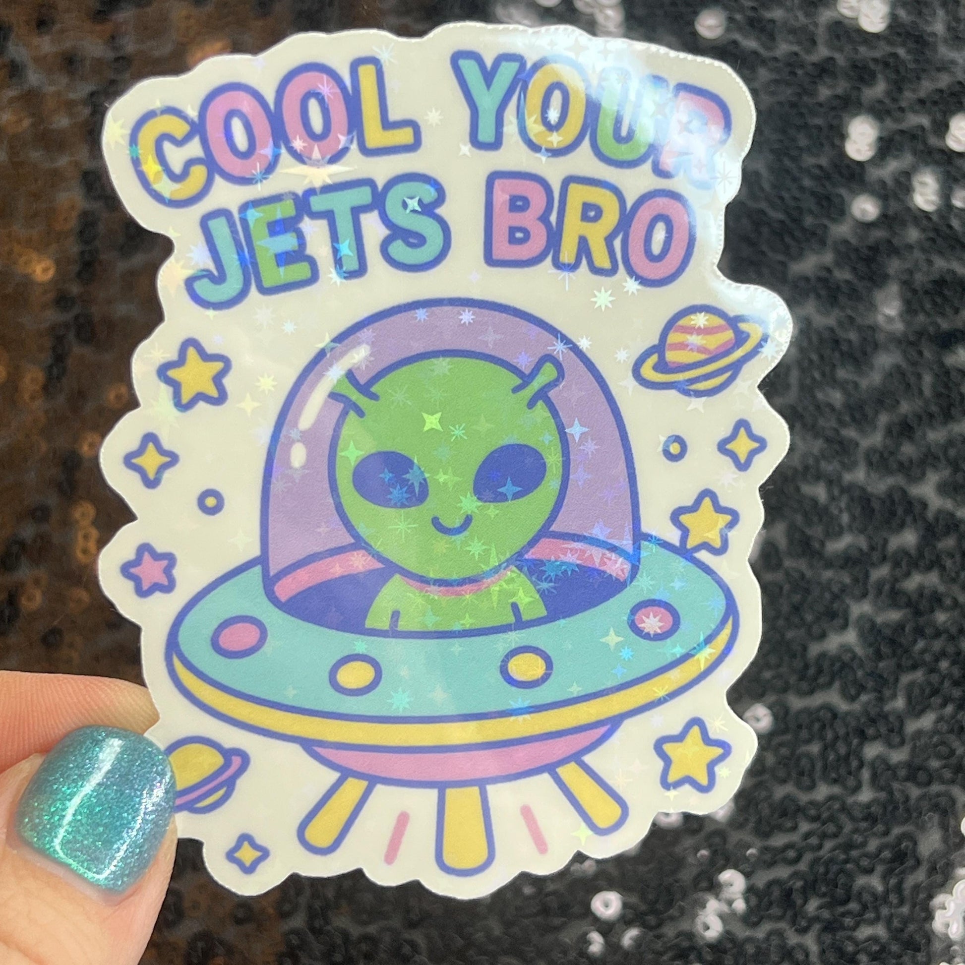 This Cool Your Jets alien sticker features a shimmering holographic design and measures 3 inches at its longest point. It’s a fun and uplifting reminder to stay positive and prioritize self-care.