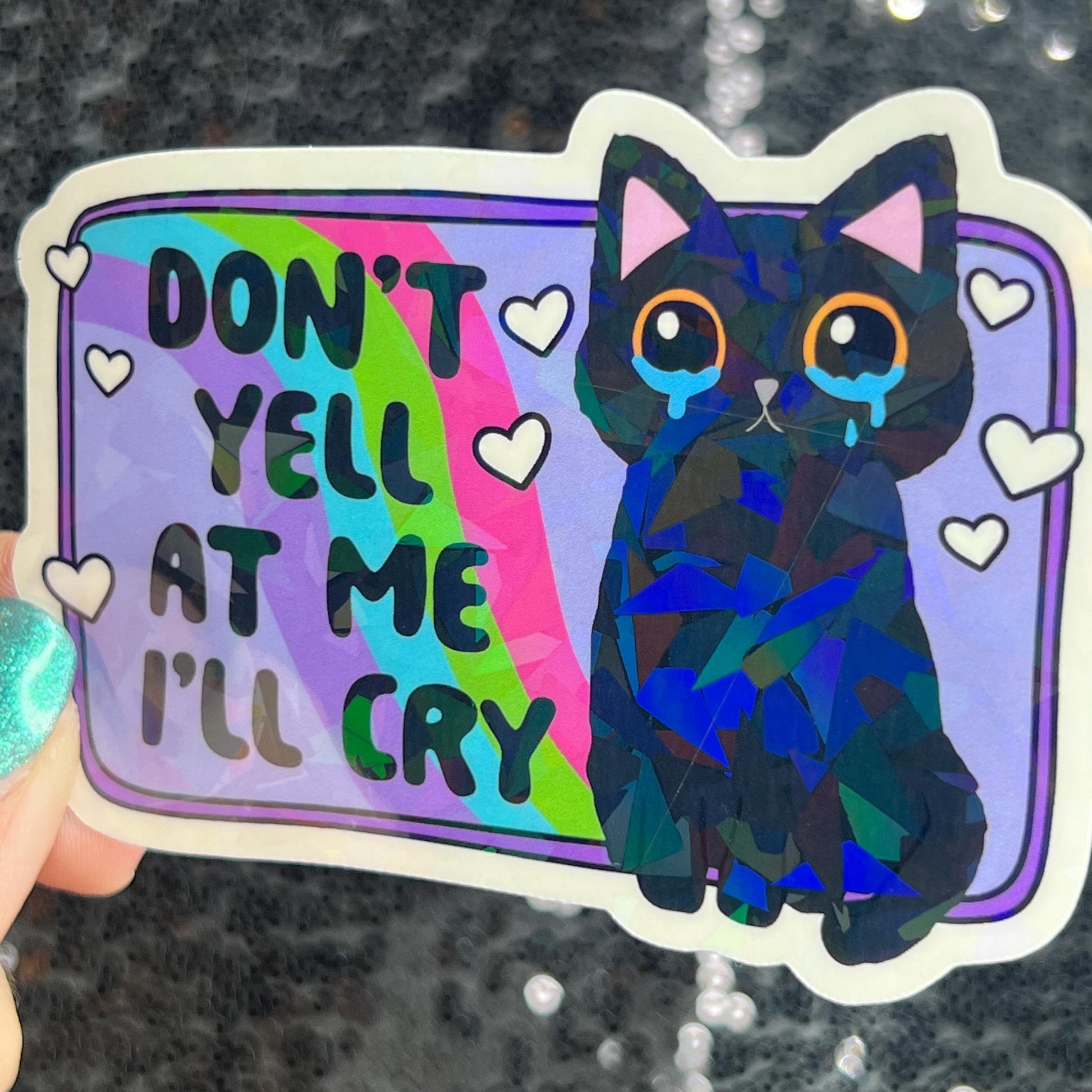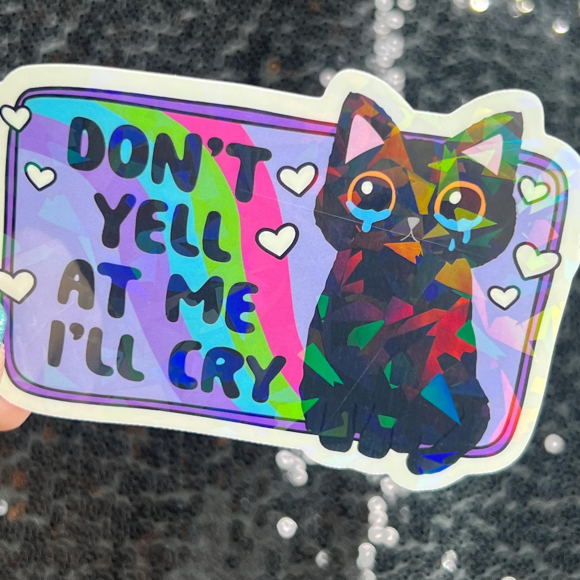 This 3-inch sticker boldly displays the phrase, "Don't yell at me I'll cry," with sharp lettering and vibrant holographic colors that make it pop. Made from durable, high-quality holographic vinyl, it resists water and everyday wear, keeping its bright shine intact. Perfect for personalizing laptops, water bottles, notebooks, or any surface that could use a touch of fun and positivity, this sticker is a standout accessory that invites smiles and conversation.