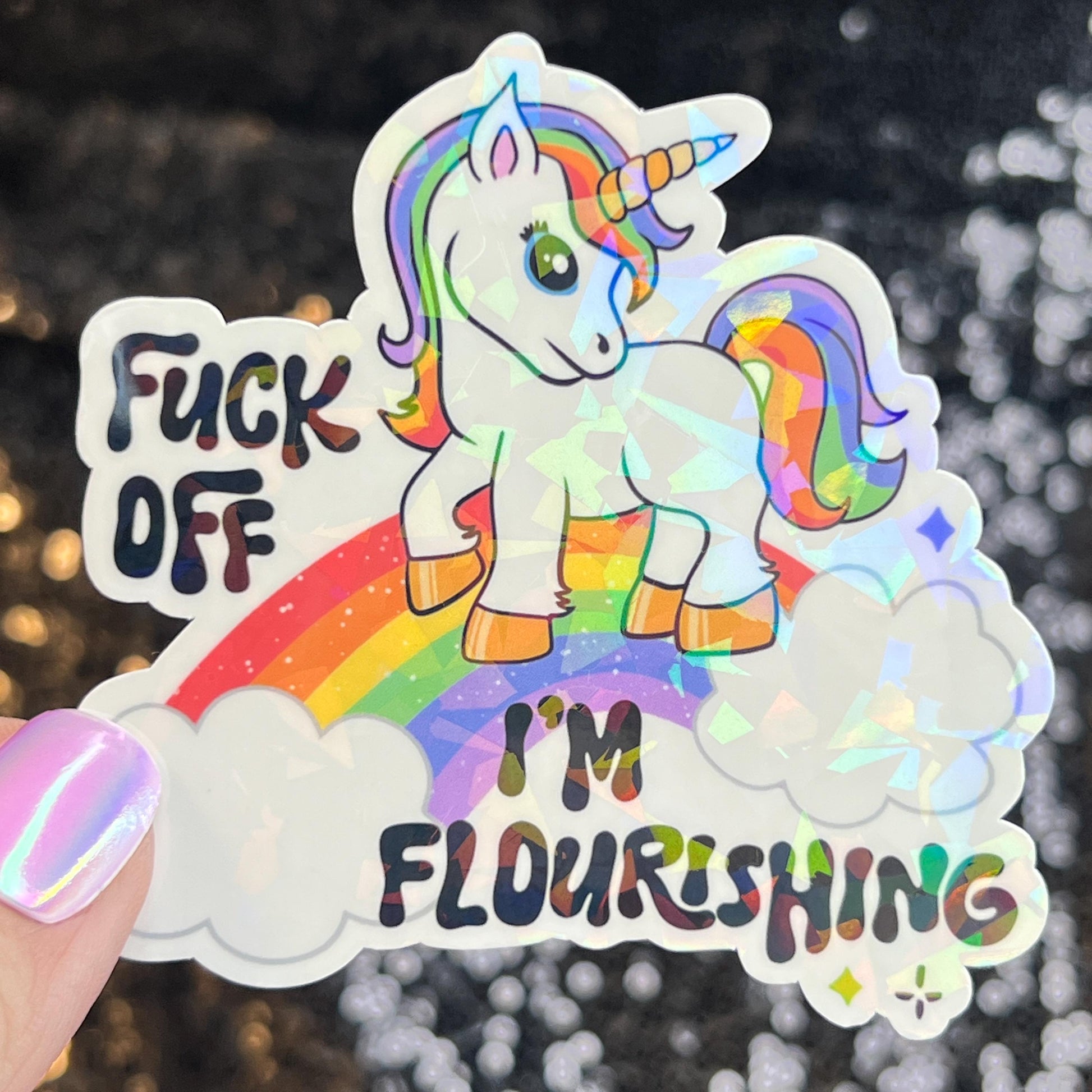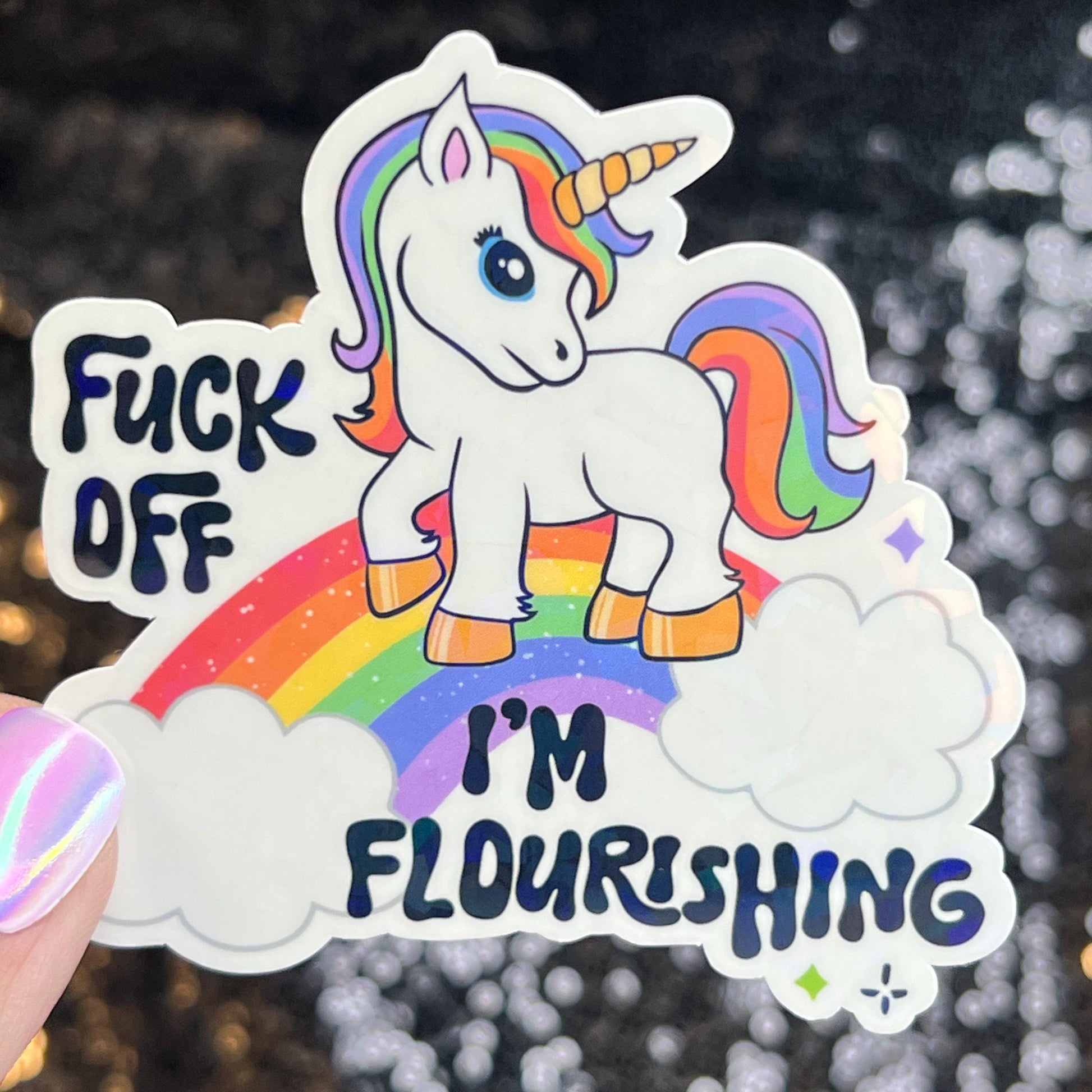 F Off I'm Flourishing Sparkly Holographic Unicorn Rainbow Sticker Sassy Funny Girl Boss Positive Mindset Good Vibes Inspiration Motivational