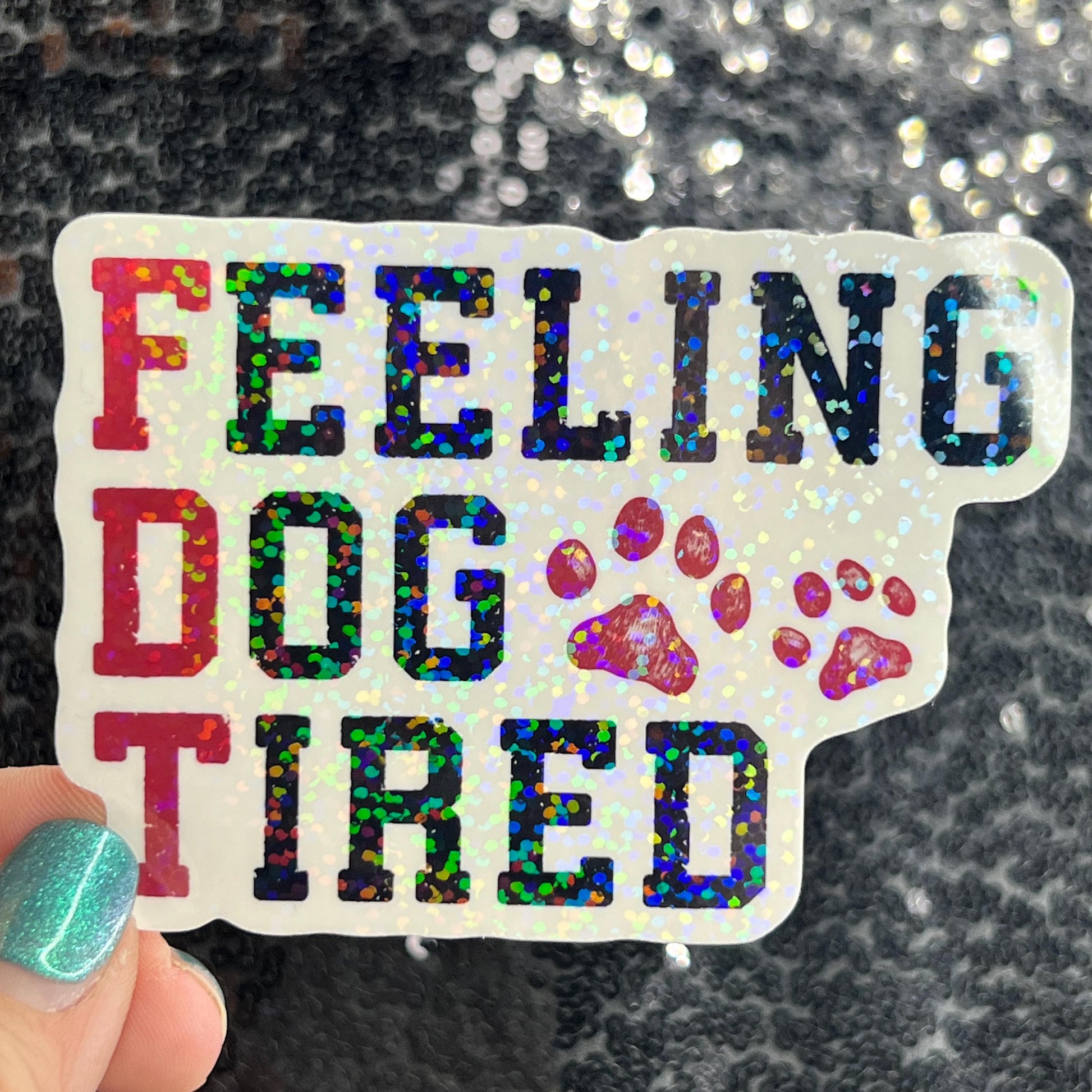 This “Feeling Dog Tired” sticker measures 3 inches at its longest point and boasts sharp typography with vivid holographic colors that grab attention. Made from durable, high-quality holographic vinyl, it’s built to last and resist water, keeping its shine through everyday use. Perfect for personalizing laptops, water bottles, notebooks, or any item that could use a bold, eye-catching accent, this sticker is a great way to express yourself and start conversations.