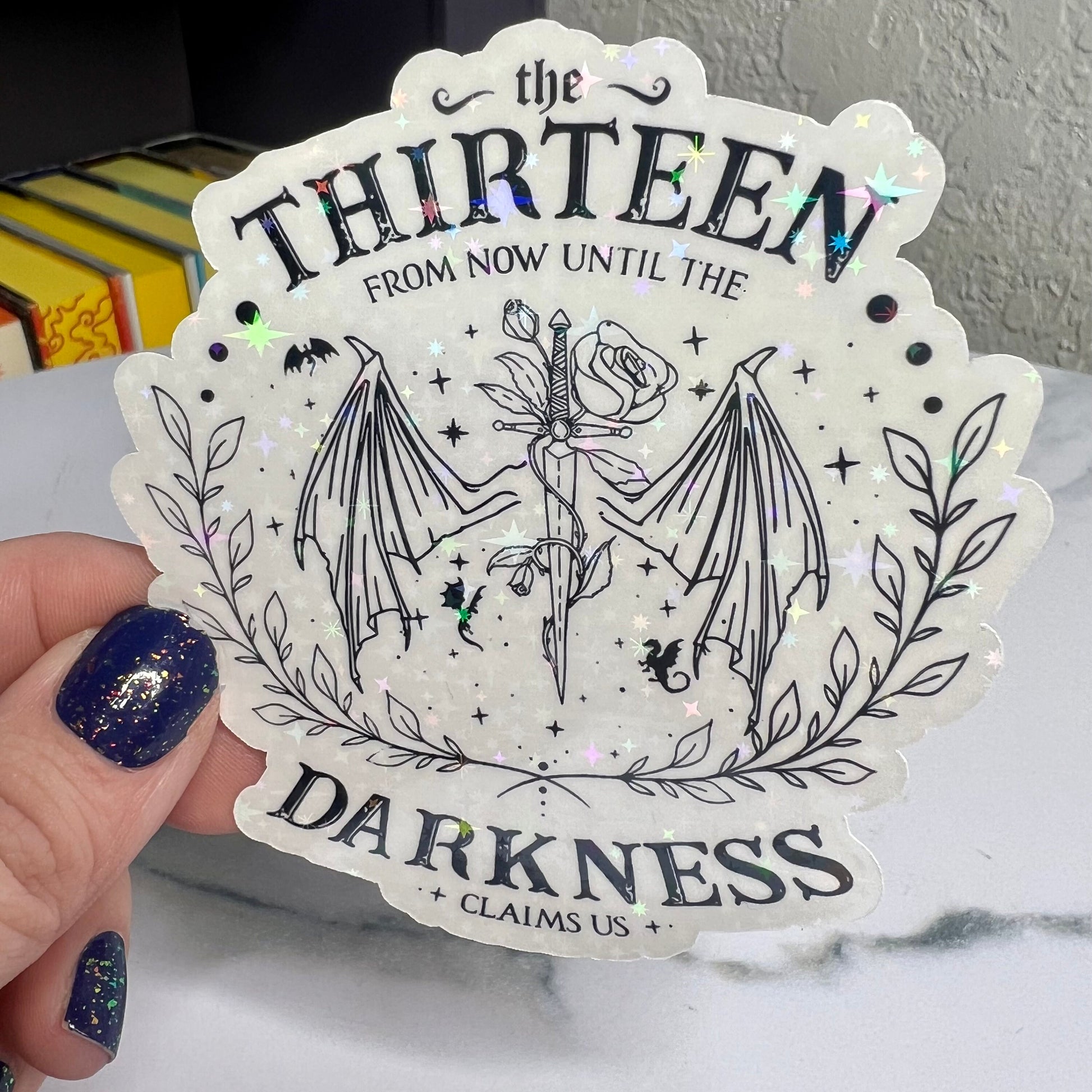 The Thirteen From Now Until the Darkness Claims Us Throne of Glass sticker is 3.5 inches on the longest side.