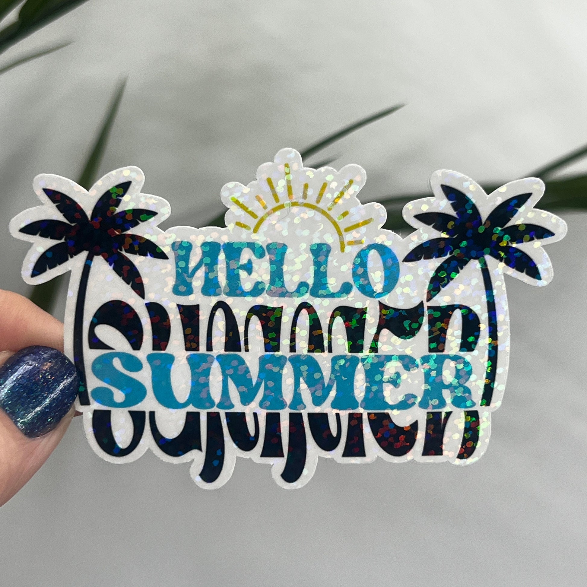 The Hello Summer holographic sticker measures 3 inches at its longest point and features vibrant colors with a striking holographic shine that sparkles in any light. Designed with precision, this durable decal is waterproof and weather-resistant, making it ideal for personalizing laptops, water bottles, phone cases, notebooks, and much more. Add a touch of summer magic wherever you go!