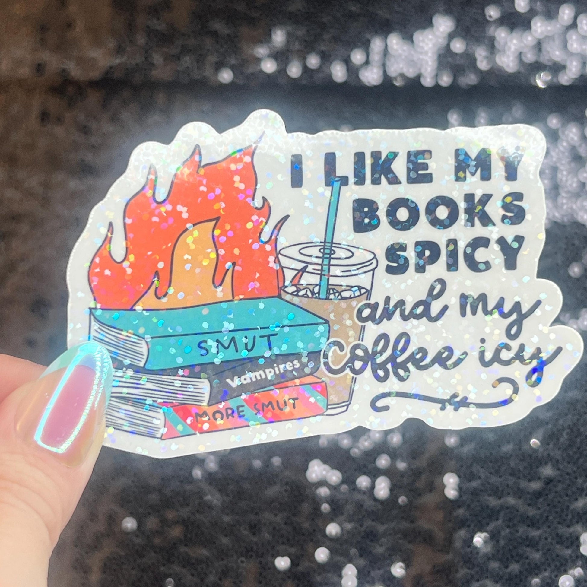 I Like my Books Spicy and my Coffee Icy Sparkly Sticker Holographic Book Lover, Spicy Dark Romance, Booktok, kindle laptop Romance Decal