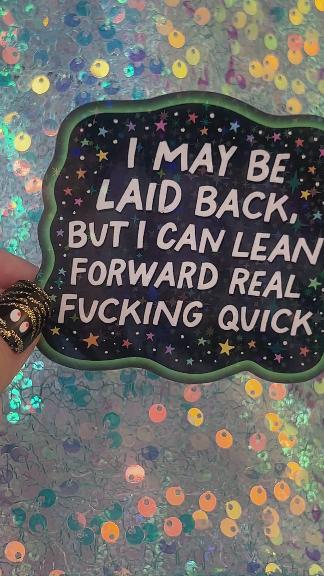 This 3-inch sticker boldly displays “I May Be Laid Back But I Can Lean Forward Real Fucking Quick” with sharp typography and vivid colors that command attention. Made from premium holographic vinyl, it offers a dazzling finish that resists water and everyday wear. Perfect for personalizing laptops, water bottles, notebooks, or any surface, this durable sticker adds style and sparks conversation wherever it’s placed.