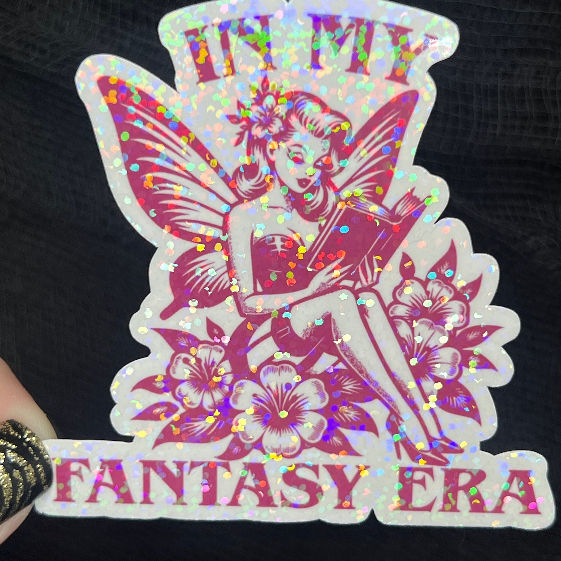 The In My Fantasy Era fairy holographic sticker measures 3 inches at its longest point and showcases vibrant colors with a captivating holographic shine that shifts with the light. Designed for durability, this waterproof and weather-resistant decal is ideal for personalizing laptops, water bottles, phone cases, and notebooks. Bring a touch of magic everywhere you go—just keep in mind that colors might look a bit different depending on your screen settings.