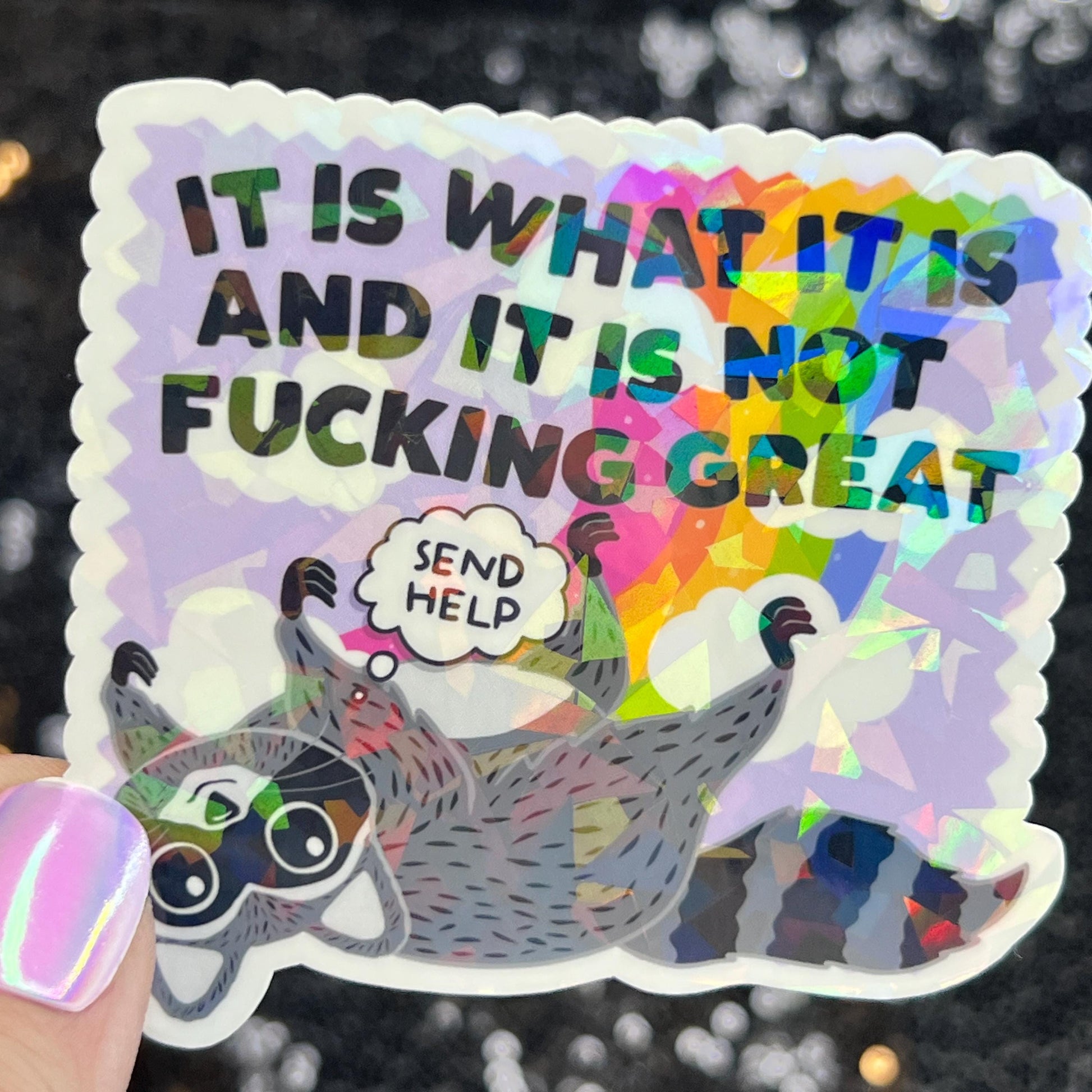This 3-inch holographic sticker boldly captures the sentiment, "It is what it is and it is not fucking great...send help." Perfect for expressing your frustration with a touch of dark humor, it adds personality to laptops, journals, and more. Made from durable, high-quality holographic vinyl, it shines brilliantly and resists water and everyday wear. Whether on water bottles or notebooks, this eye-catching decal offers a fun, lasting way to remind yourself—and others—that it’s okay to question life’s chaos.