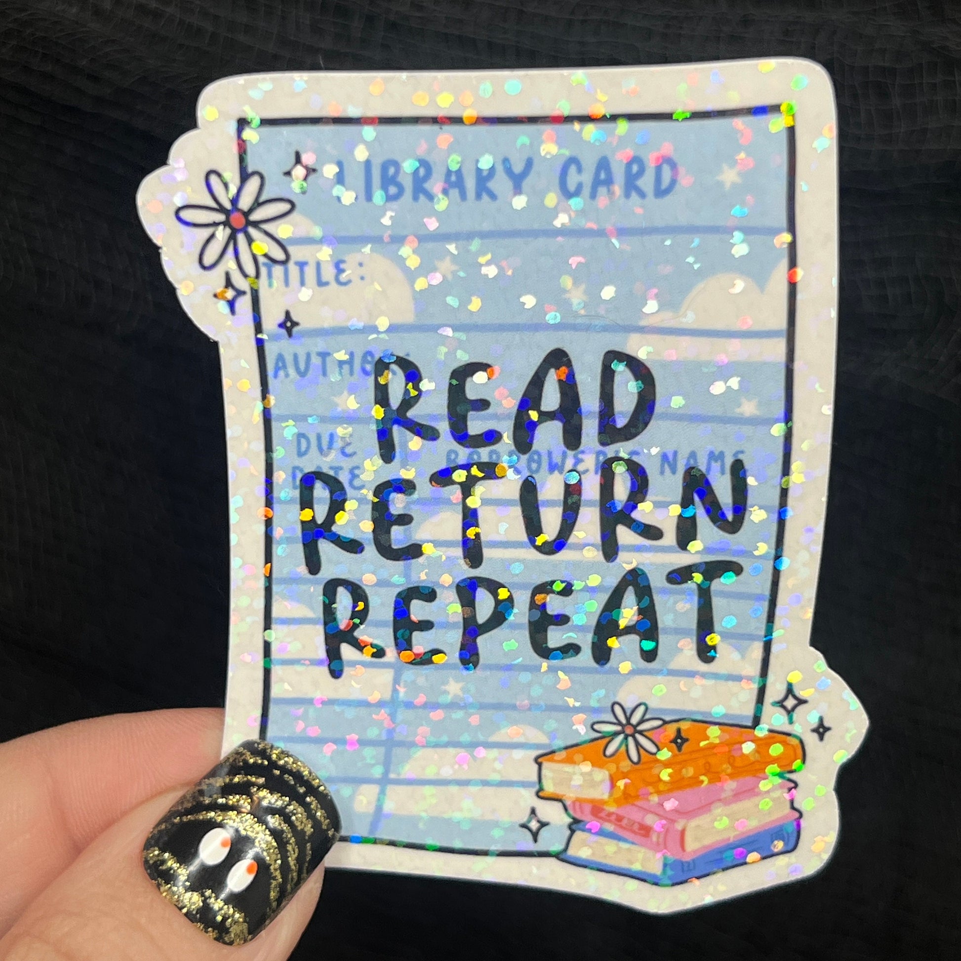 Library Card Read Return Repeat Sparkly Holographic Sticker Decal, Librarian Gift kindle waterbottle laptop Reader Bookish Present Gift