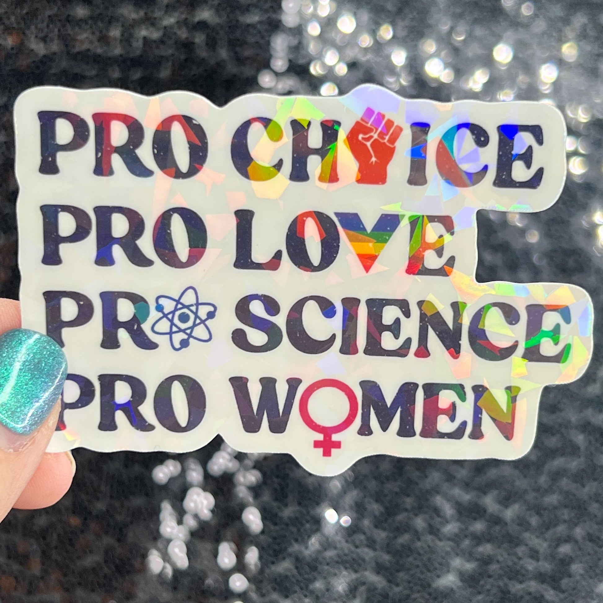 This striking sticker displays the message, “Pro Choice Pro Love Pro Science Pro Women,” measuring 3 inches at its longest point. Featuring sharp typography and bright, holographic colors, it commands attention on any surface. Made from premium, water-resistant vinyl, it’s built to last and keep its shine through everyday use. Perfect for personalizing laptops, water bottles, notebooks, or any item that could use a bold statement, this sticker is a powerful way to express your values and inspire dialogue.