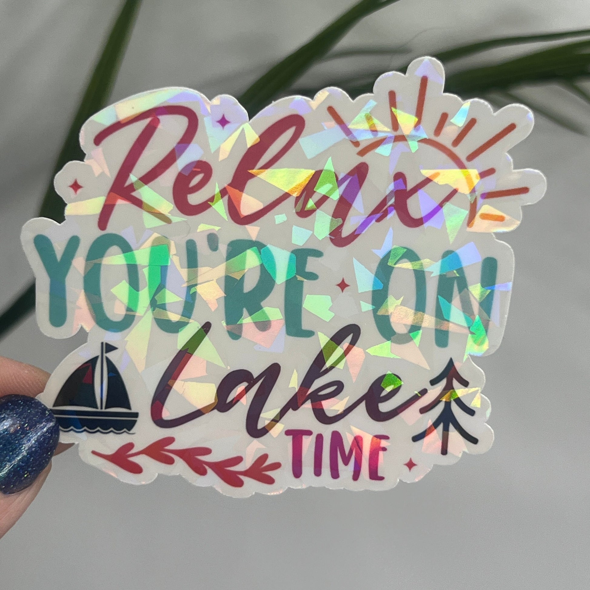 Relax You're On Lake Time Holographic Sparkly Sticker Boating Outdoor Decal Nature Adventure Sticker Lake House Sticker Lake Life