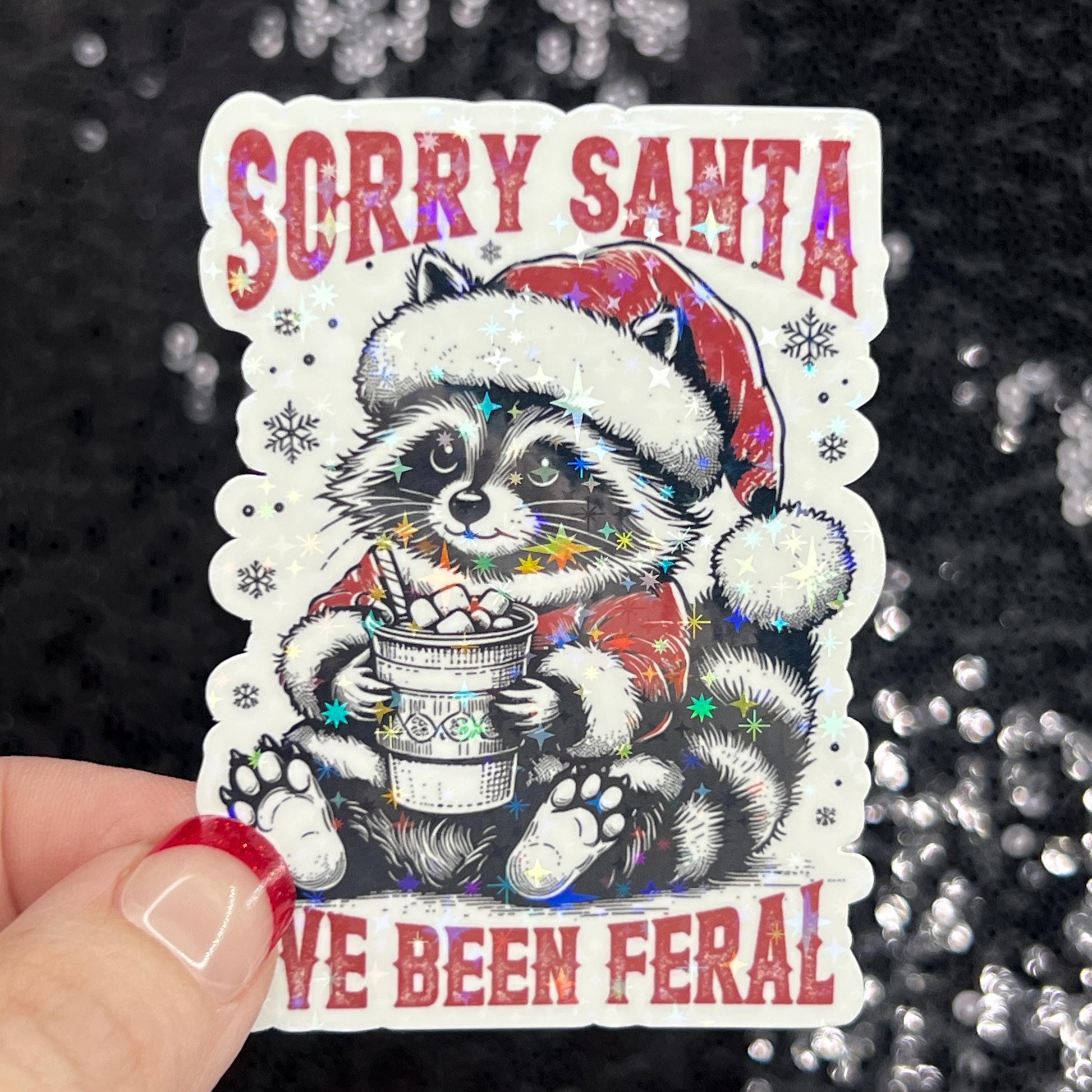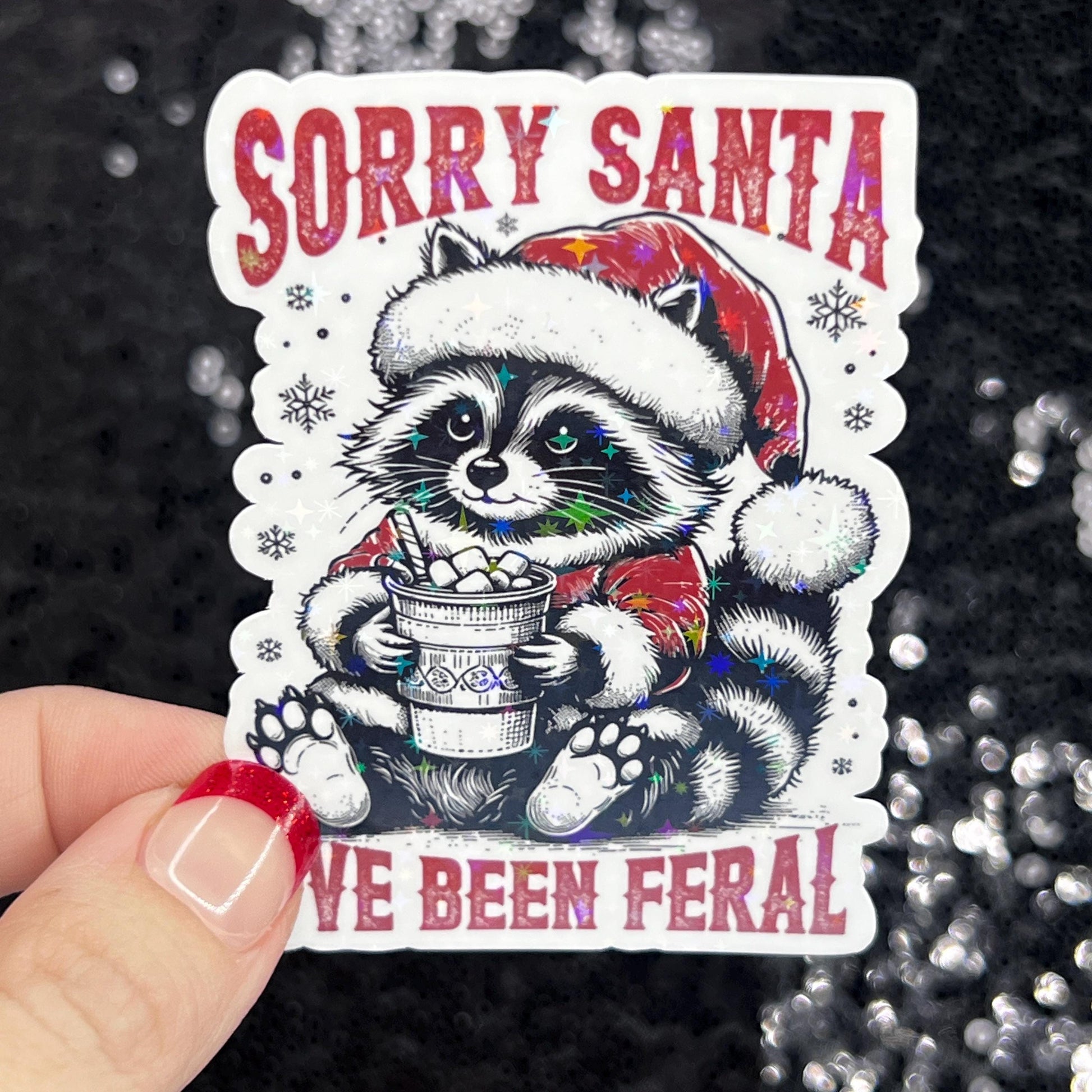 Sorry Santa I’ve Been Feral Christmas Raccoon Sticker – Funny Holographic Holiday Sticker, 3-Inch Party Decal | Xmas Gift & Stocking Stuffer