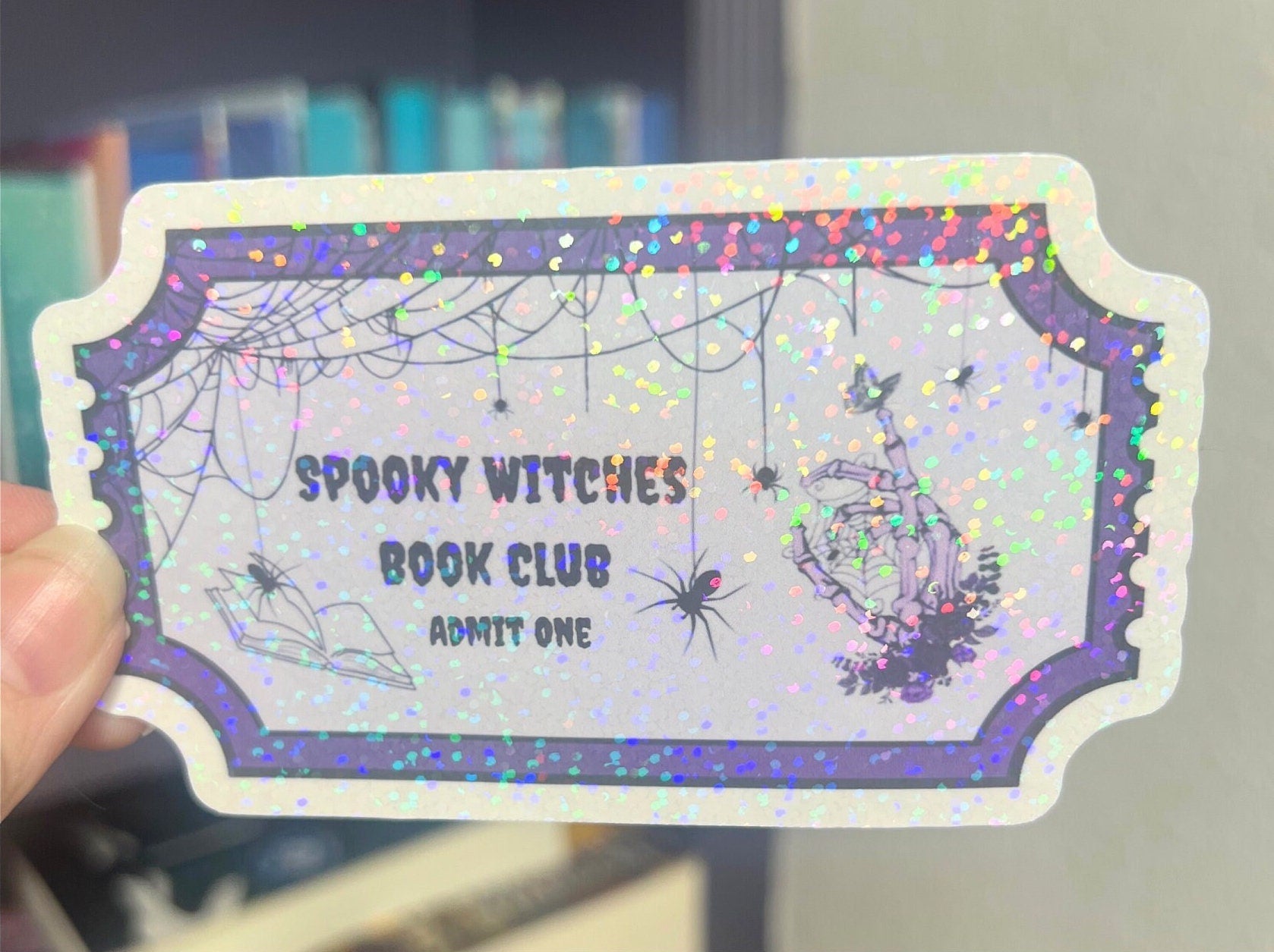 Spooky Witches Book Club Sticker is about 4 inches on the long side. These holographic stickers is meticulously crafted with attention to detail, ensuring vibrant colors and a mesmerizing holographic effect that catches the light from every angle. Its durable, waterproof, and weather-resistant properties make it perfect for decorating various surfaces such as kindles, laptops, notebooks, water bottles, phone cases, and more. Please avoid putting it in the dishwasher though. Please note that the colors may vary slightly due to monitor settings.