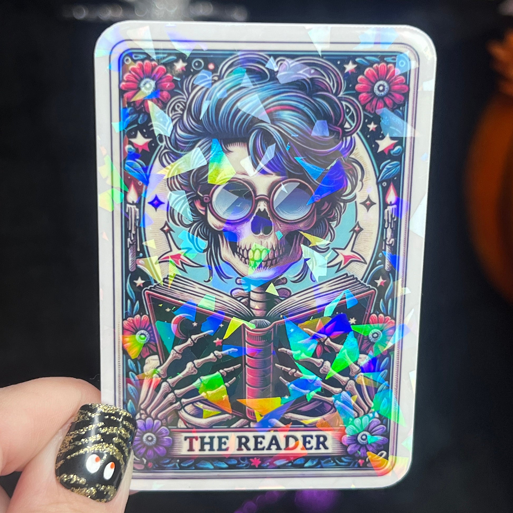 The Reader Tarot Card Sticker Holographic Book Lover Sparkly Decal, Spicy Dark Romance, kindle waterbottle laptop