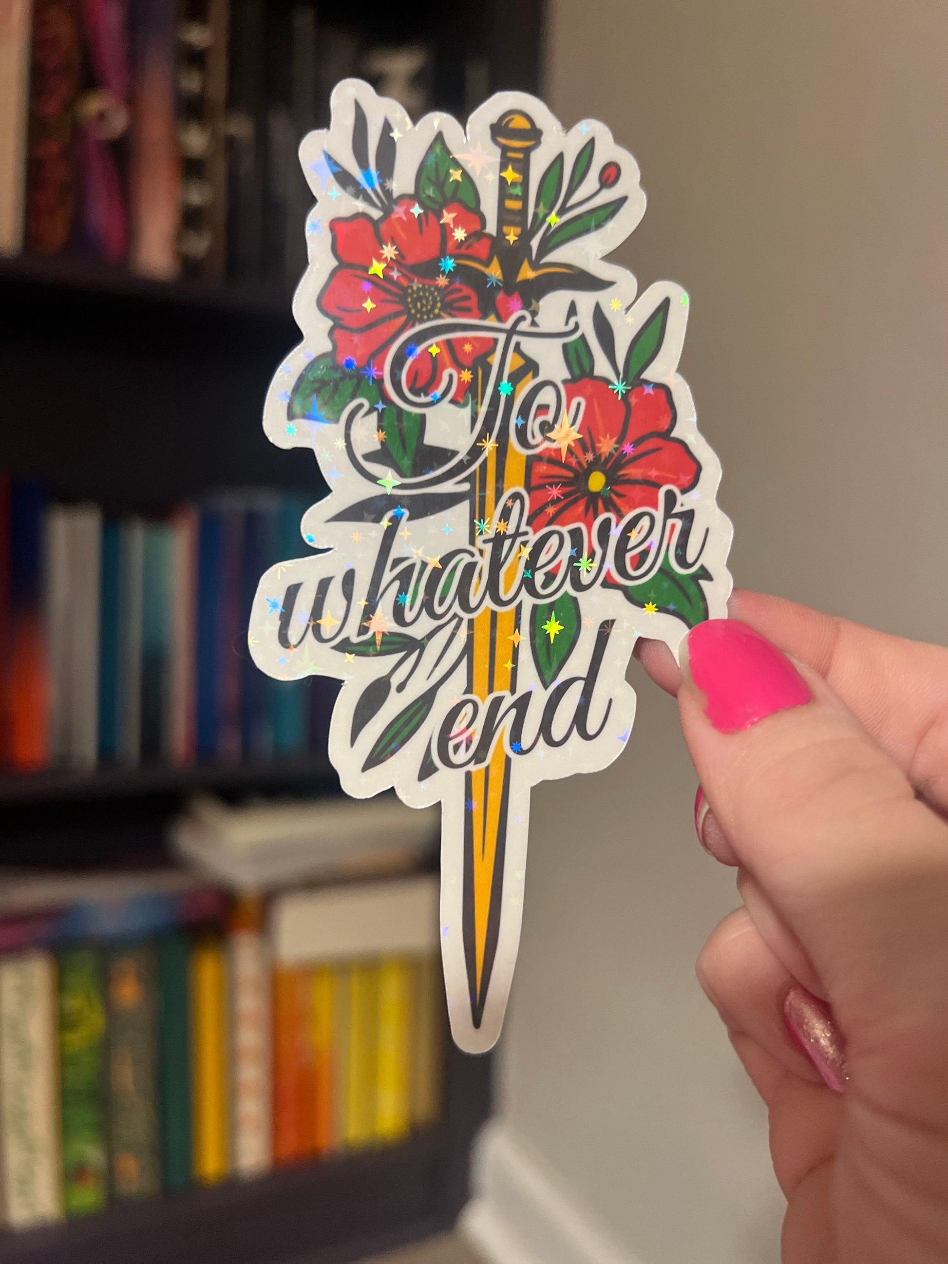 Elevate your belongings with our dazzling Throne of Glass holographic sticker, designed to infuse a spark of fantasy into everyday life. Featuring a striking sword intertwined with delicate flowers and the inspiring phrase "To Whatever End," this sticker captures the essence of the beloved series. Crafted for brilliance, its vibrant holographic shine catches light from every angle, while its durable, waterproof design ensures lasting wear on laptops, water bottles, phone cases, and more. Perfect for devoted fans or fantasy lovers, this sticker is a powerful way to celebrate courage and determination—and it makes an inspiring gift for anyone who needs a little magic in their day.
