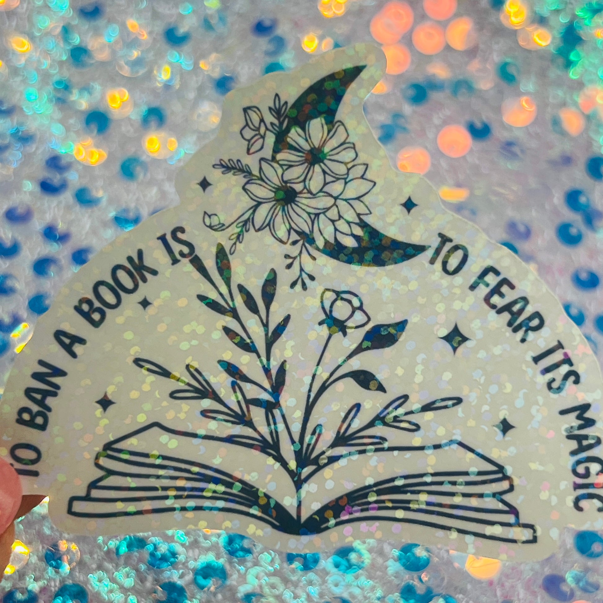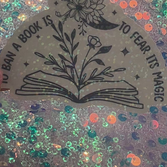 This holographic vinyl sticker features an open book blooming with flowers beneath a crescent moon and the phrase “To ban a book is to fear its magic.” It is soft, magical, and made for readers who see books as sacred.