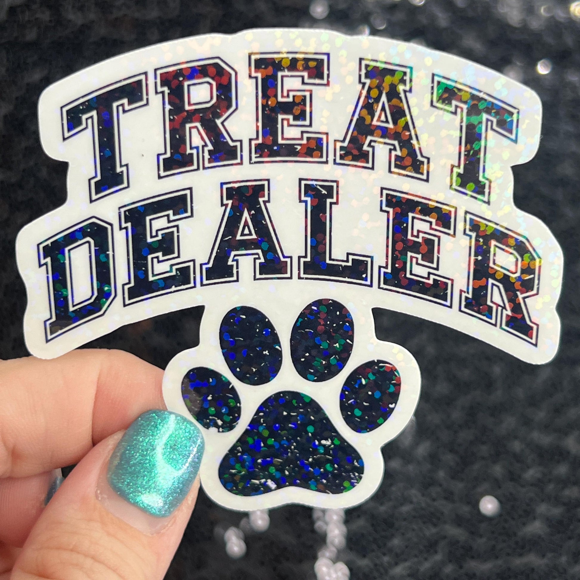 The Treat Dealer sticker measures 3 inches at its longest point and is crafted from premium holographic vinyl that resists water and scratches, ensuring lasting durability.