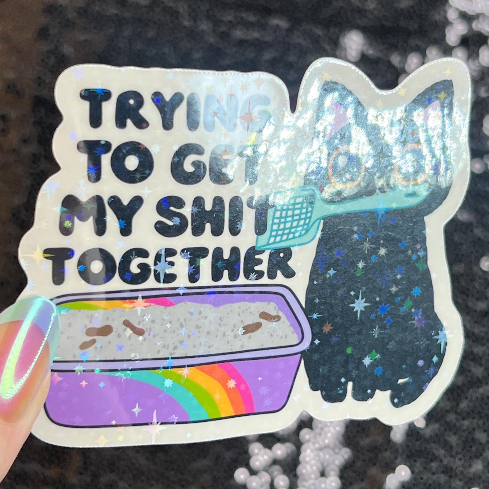 Trying to Get my Shit Together Sparkly Holographic Sticker Black Cat Mental Health Spread Good Vibes Decal ADHD Neurodivergent Sticker