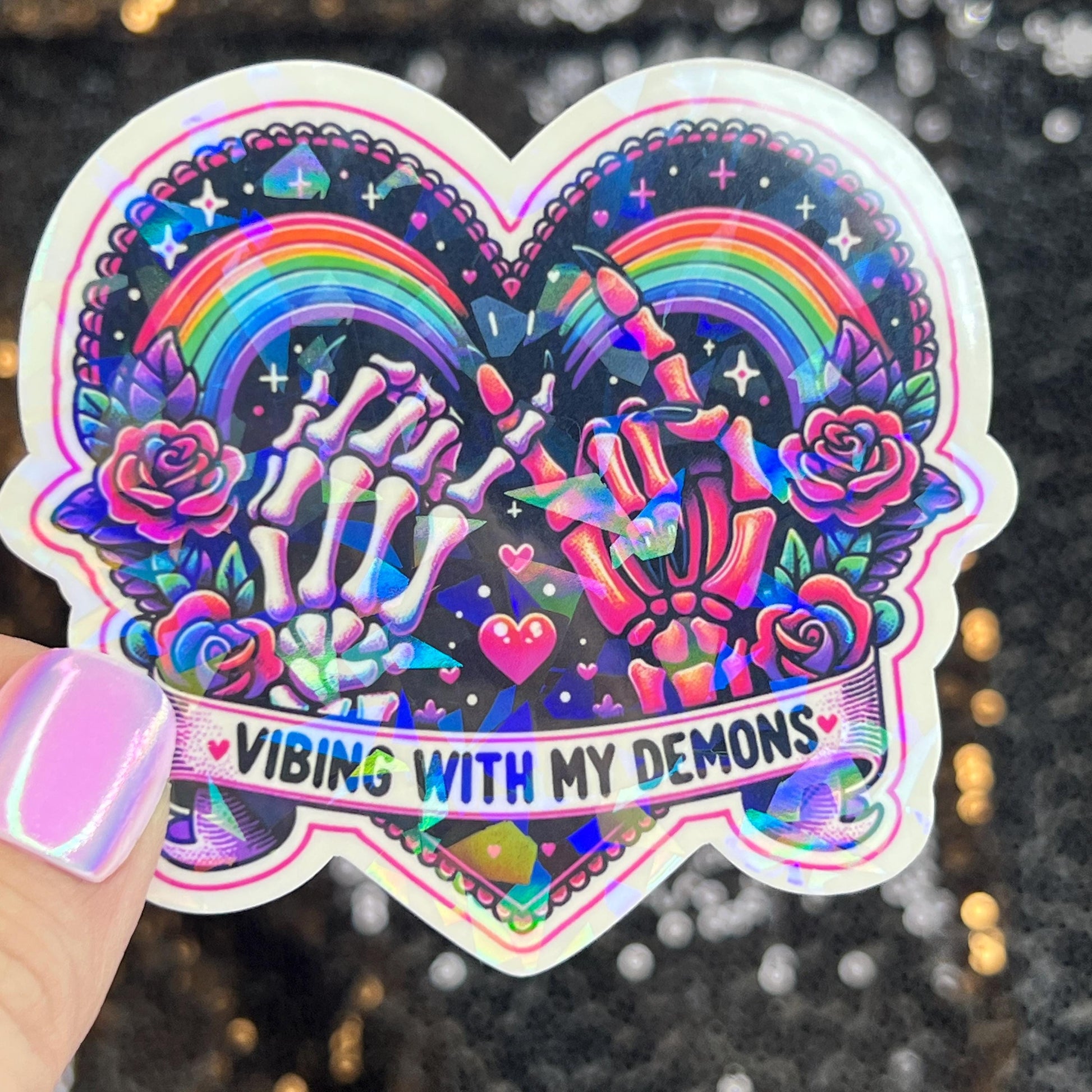 Vibing with my demons colorful Holographic Sticker Mental Health Sticker Sparkly Spread Positivity Good Vibes Decal Inspirational Rainbow